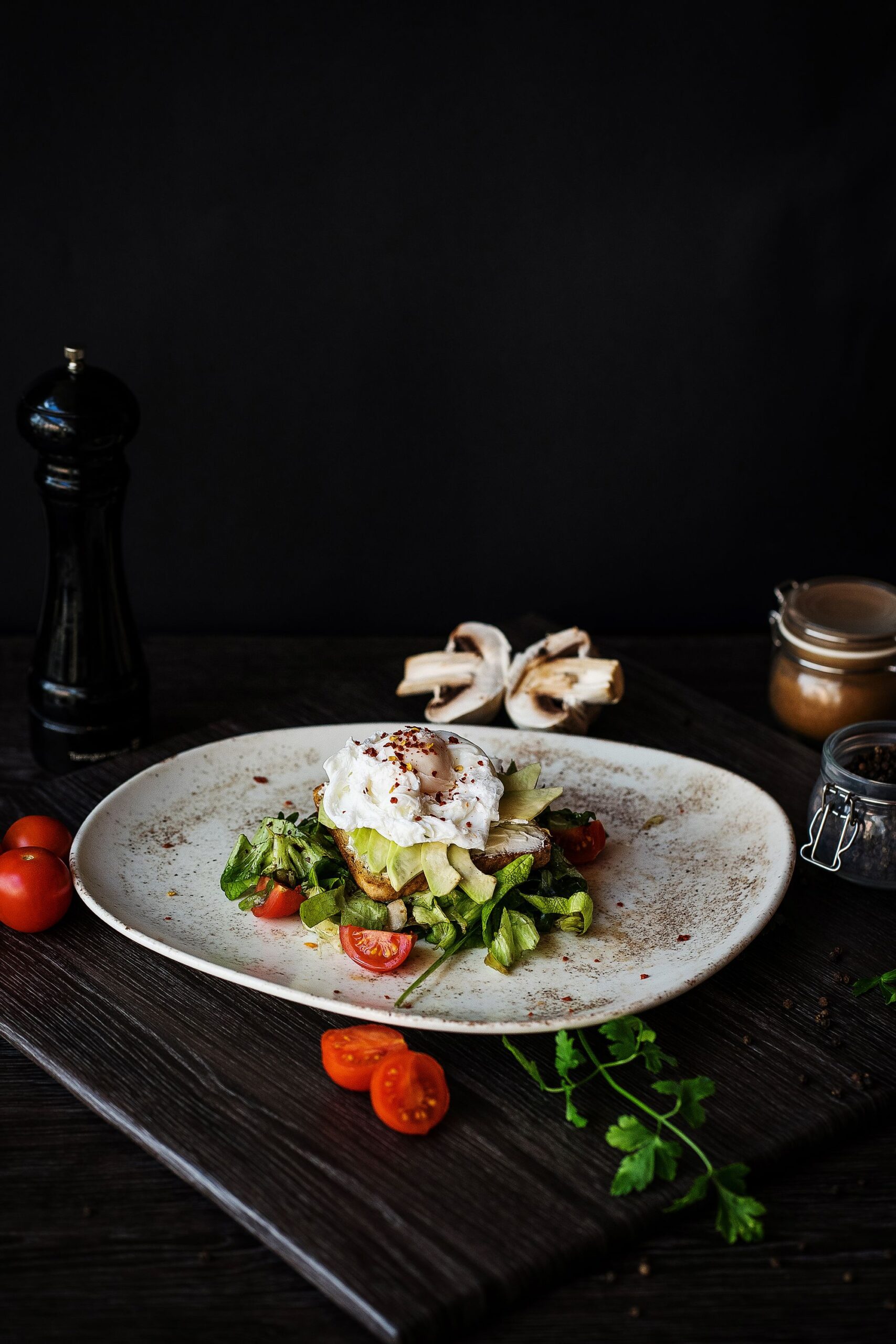 Avocado, french toast, mix de salată, ouă poșate