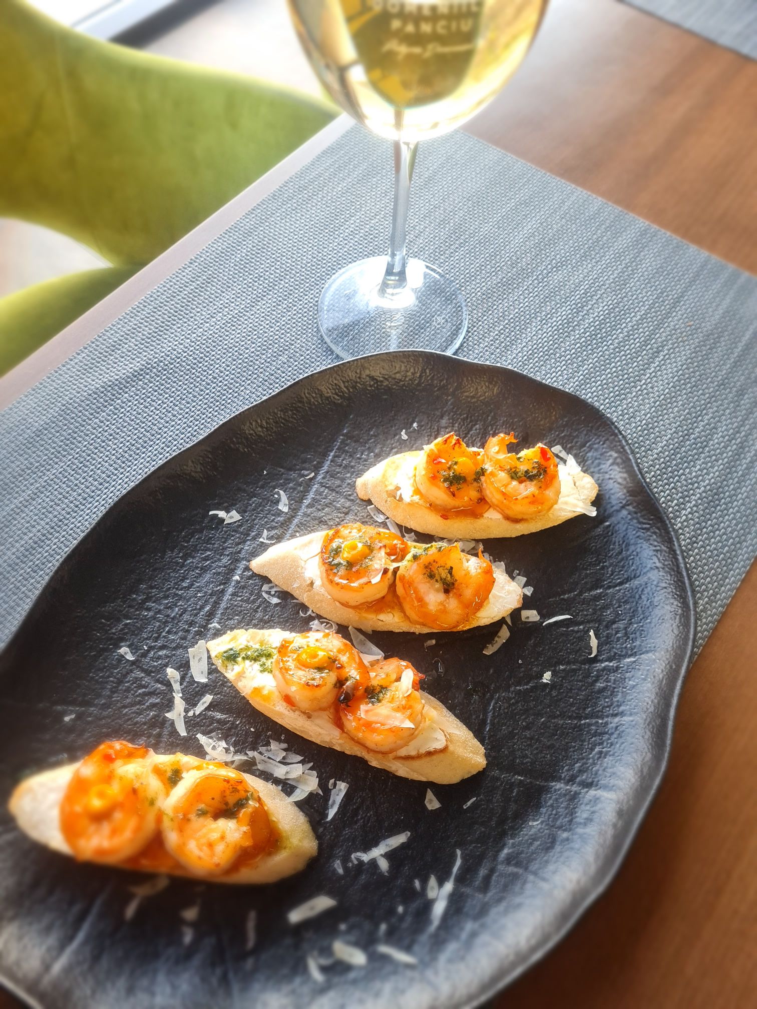 Creveţi, sos sweet chilli, unt, pătrunjel, creme fresh, baghetă