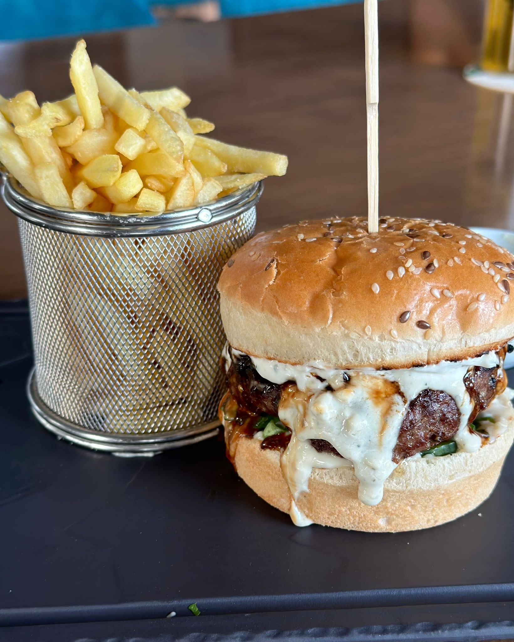 Antricot de vită, dulceață de ceapă roșie, sos Stradale, sos blue cheese, roșii, ruccolla, chiflă burger, cartofi pai, castraveciori murați