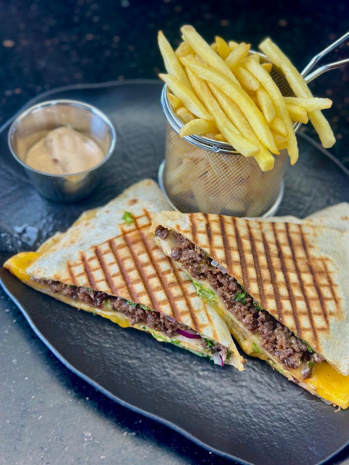 Antricot vita, lipie, castravete murat, ceapa rosie, rosii, salată verde, cheddar, sos stradale, sos sriracha, sos de maioneza, sos barbeque, cartofi pai
