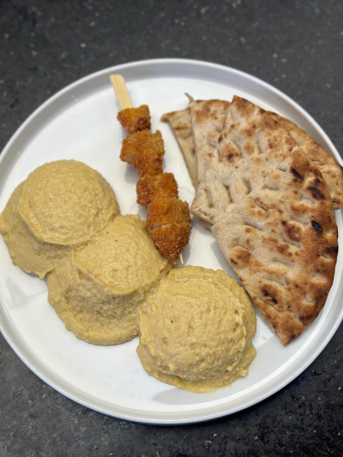 Năut, tahini, ulei de floarea soarelui, zeamă de lămâie, piept de pui, pesmet, ou, făină, pitta bread