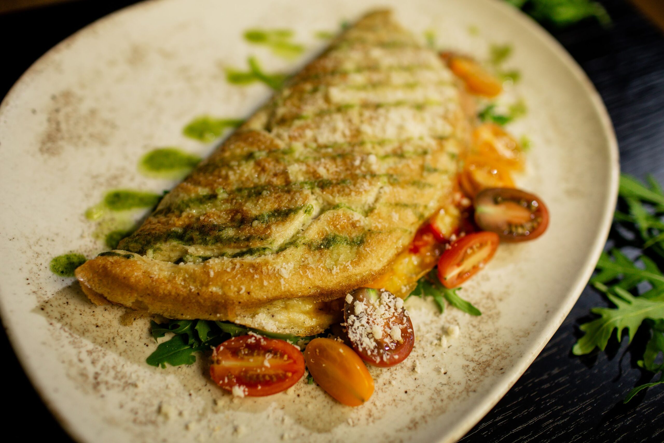 Ou, mix de brânzeturi, bacon, mix salată, roșii cherry, parmezan