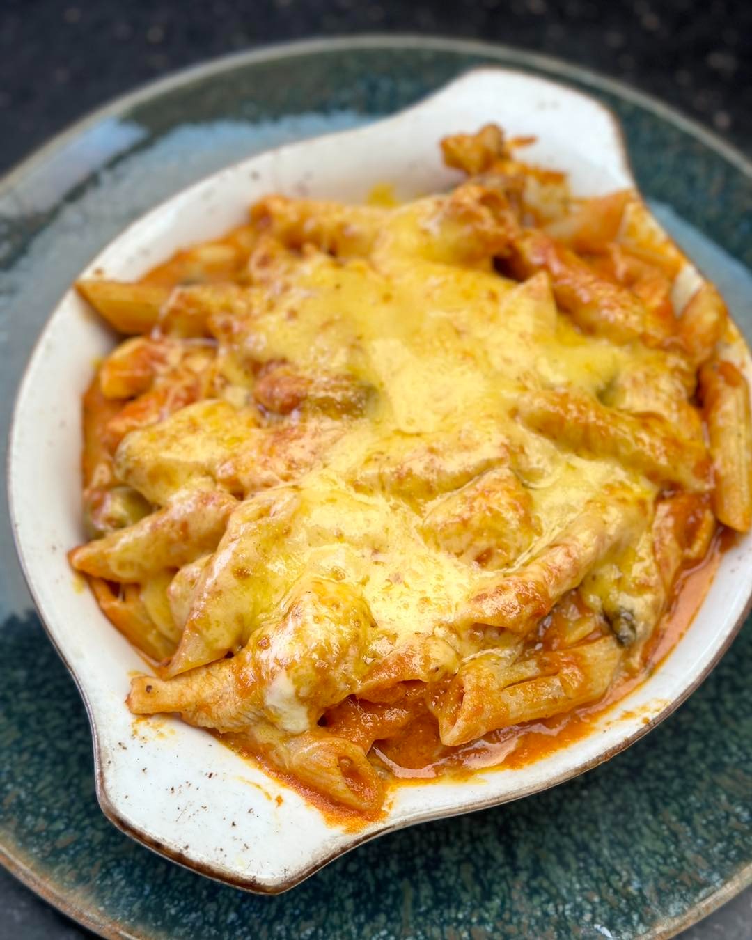 Penne, piept de pui, cheddar, ciuperci, măsline, suc roșii, smântănă, ulei, parmezan, roșii