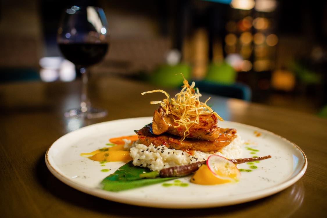 Piept de curcan, mirin, teriyaki, orez risotto, smântână lichidă, sweet chilli, parmezan, unt