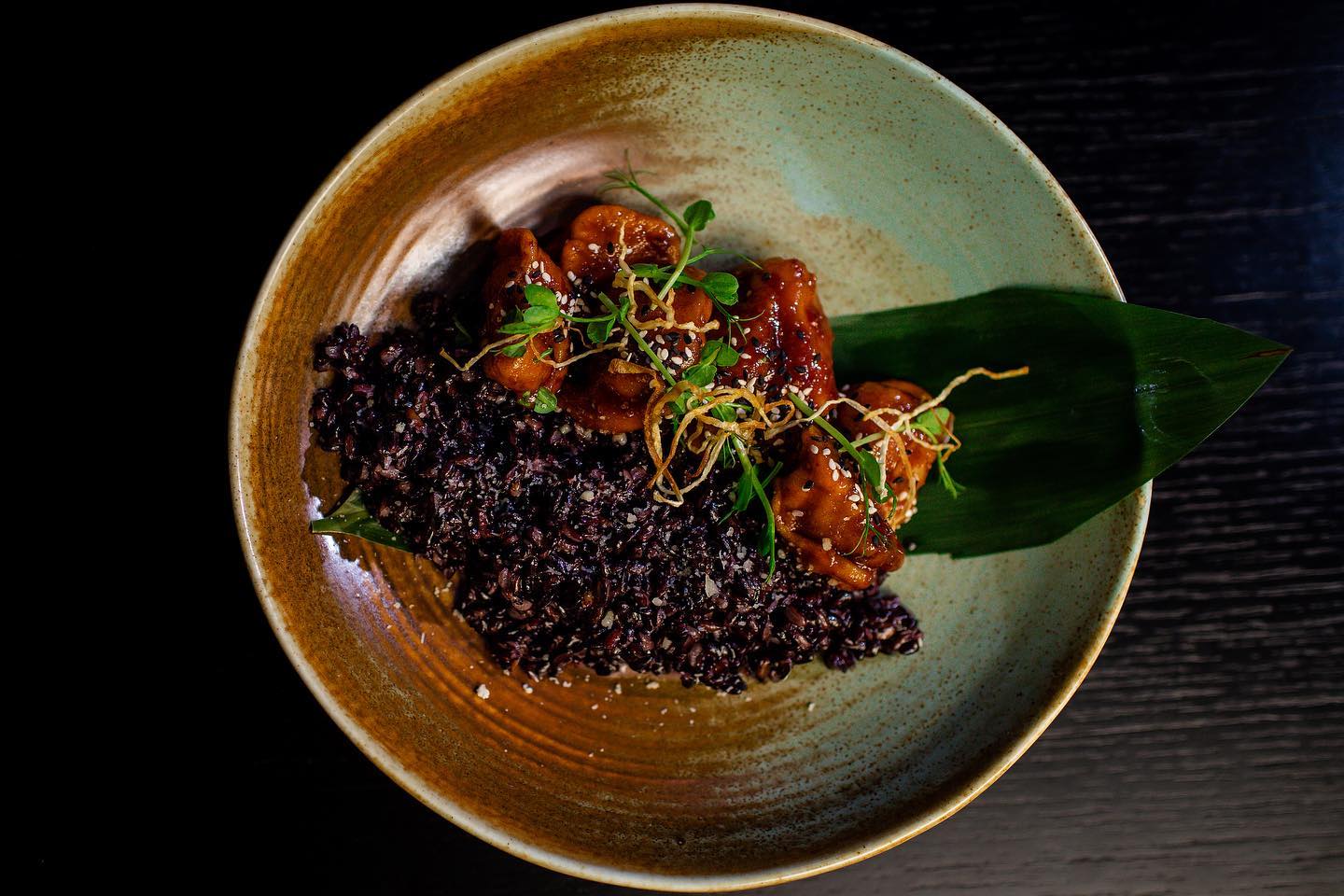 Piept de pui, orez negru, parmezan, lime, unt, făină, amidon, sos coreean –