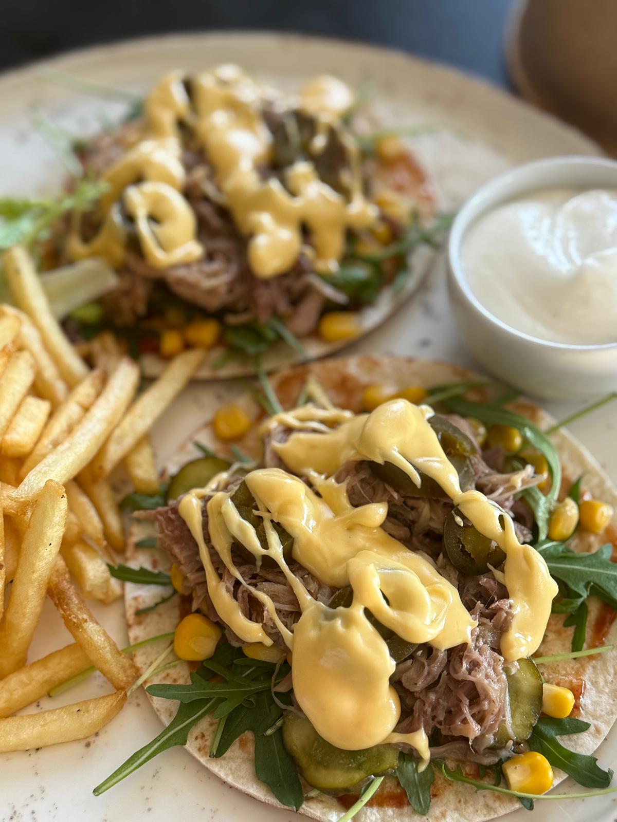 Carne pulled pork, castravete murat, salată coleslaw, sos cheddar, sos barbeque, jalapeno, porumb, cartofi, lipie