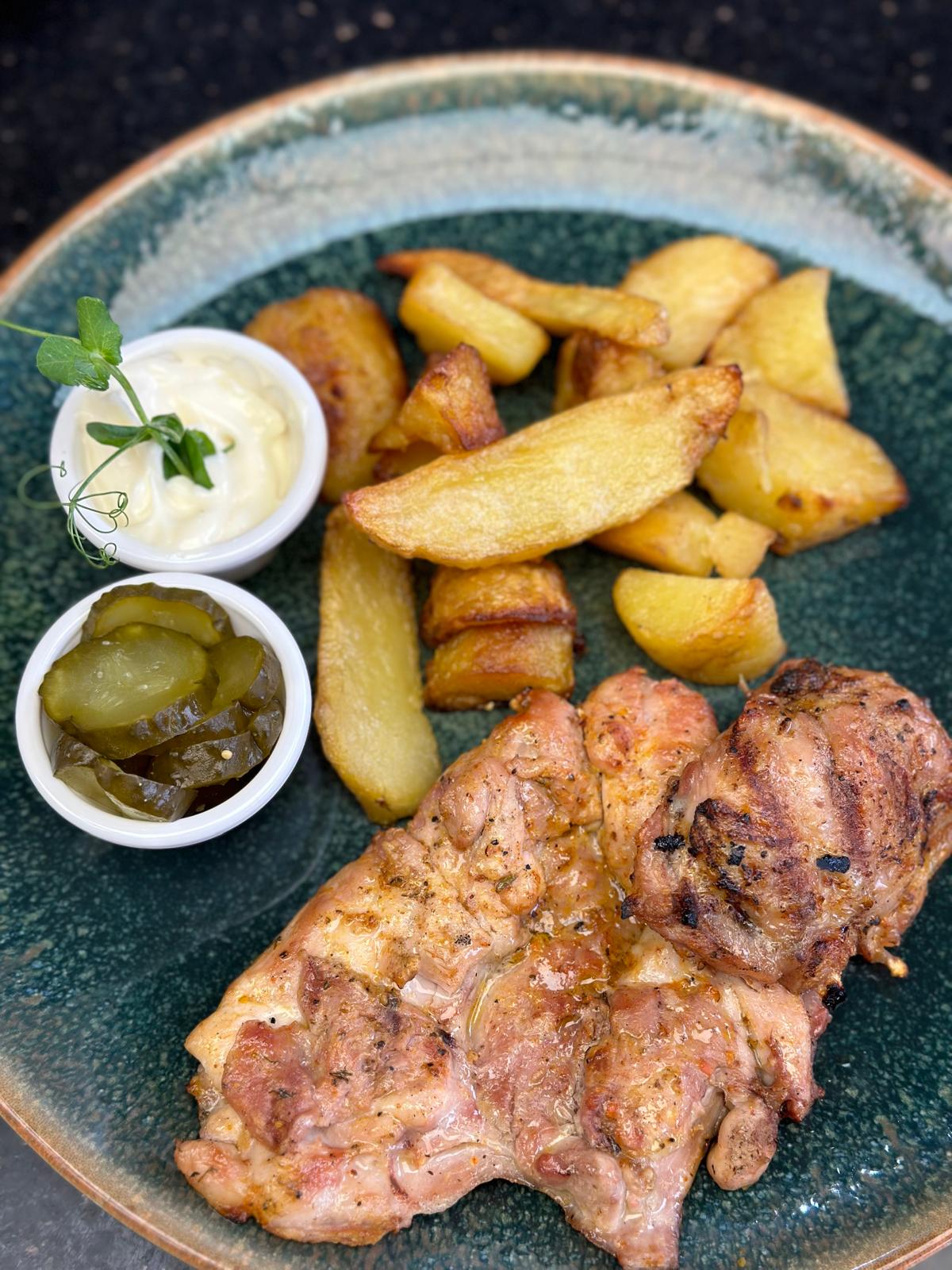 Pulpe de pui, cartofi de casa, sos maioneza, castraveciori murati