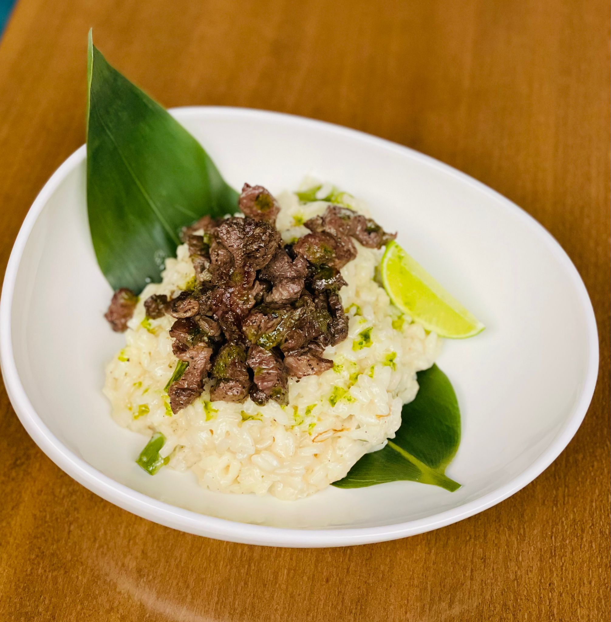 Mușchi de vită, orez risotto, lime, unt, cognac, pastă de trufe, parmezan, smântână lichidă