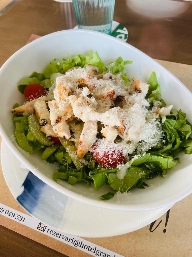 Piept de pui, mix de salata, salata Iceberg, crutoane, maioneză, parmezan, muştar Dijon, usturoi, lămâie, castravete, rosie