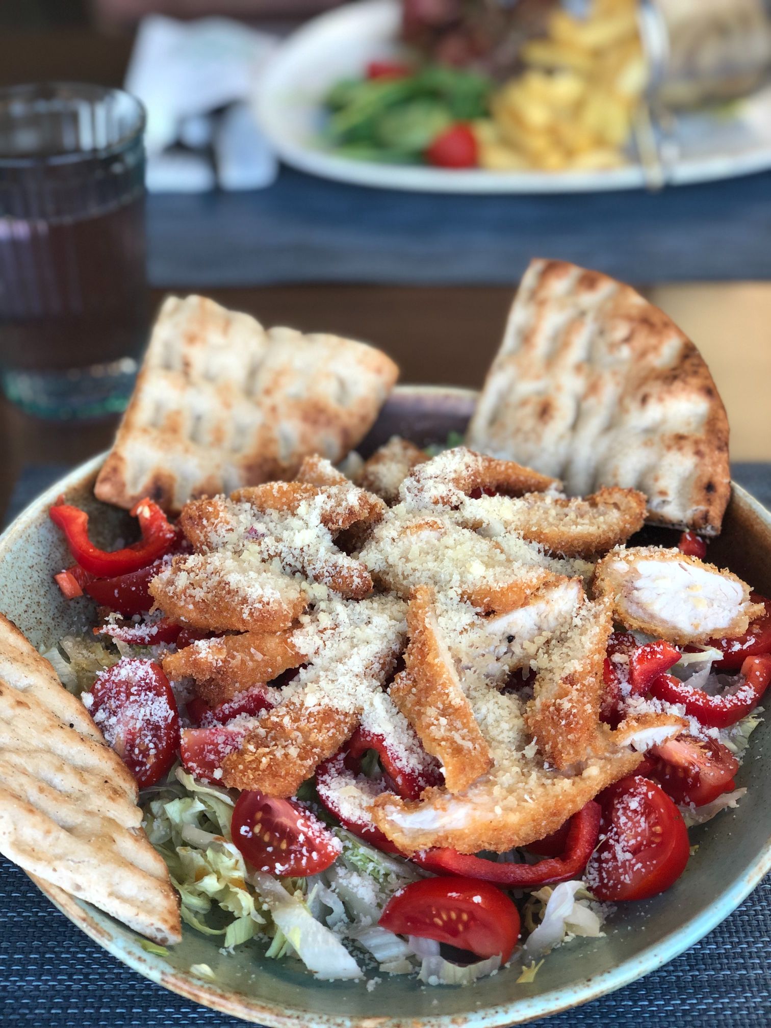 Piept de pui, mix de salată, panko, miere, oţet balsamic, parmezan, ardei, morcov