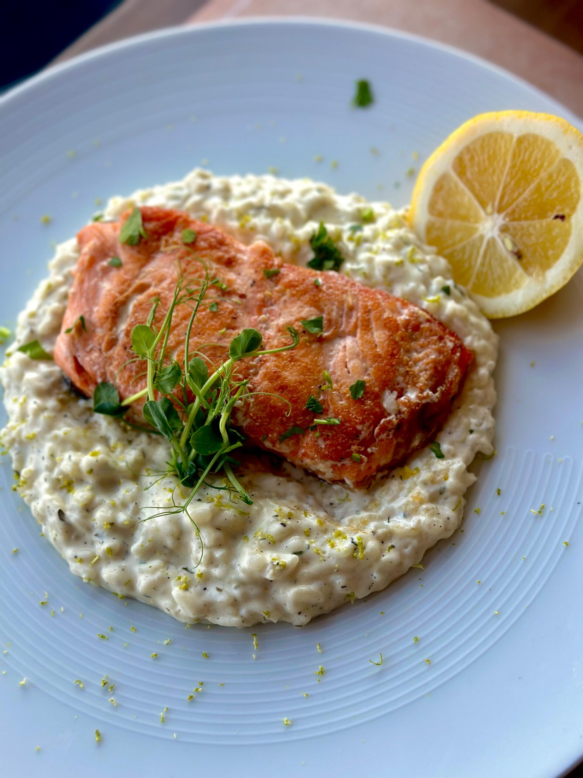 Somon, risotto, unt, parmezan, smântână de gătit
