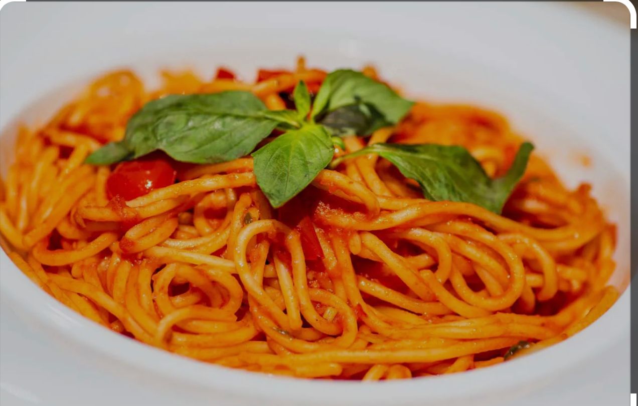 Spaghete, ceapă, roșii, usturoi, busuioc