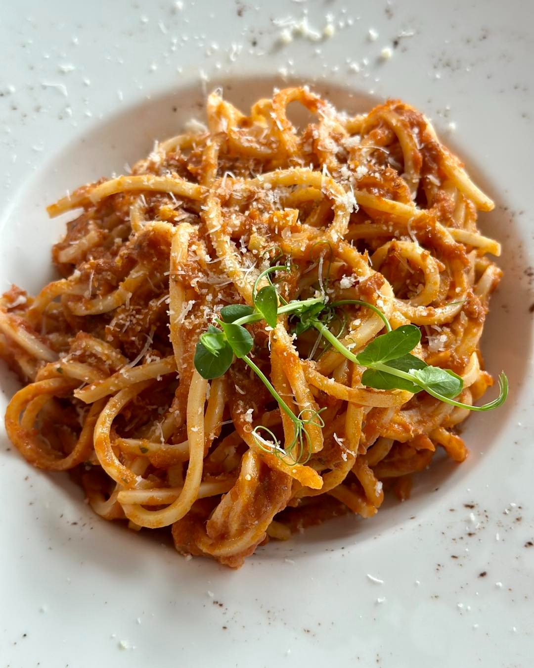 Spaghete, carne de vită, morcov, ceapă, usturoi , roșii, busuioc , parmezan, ulei, zahăr, vin