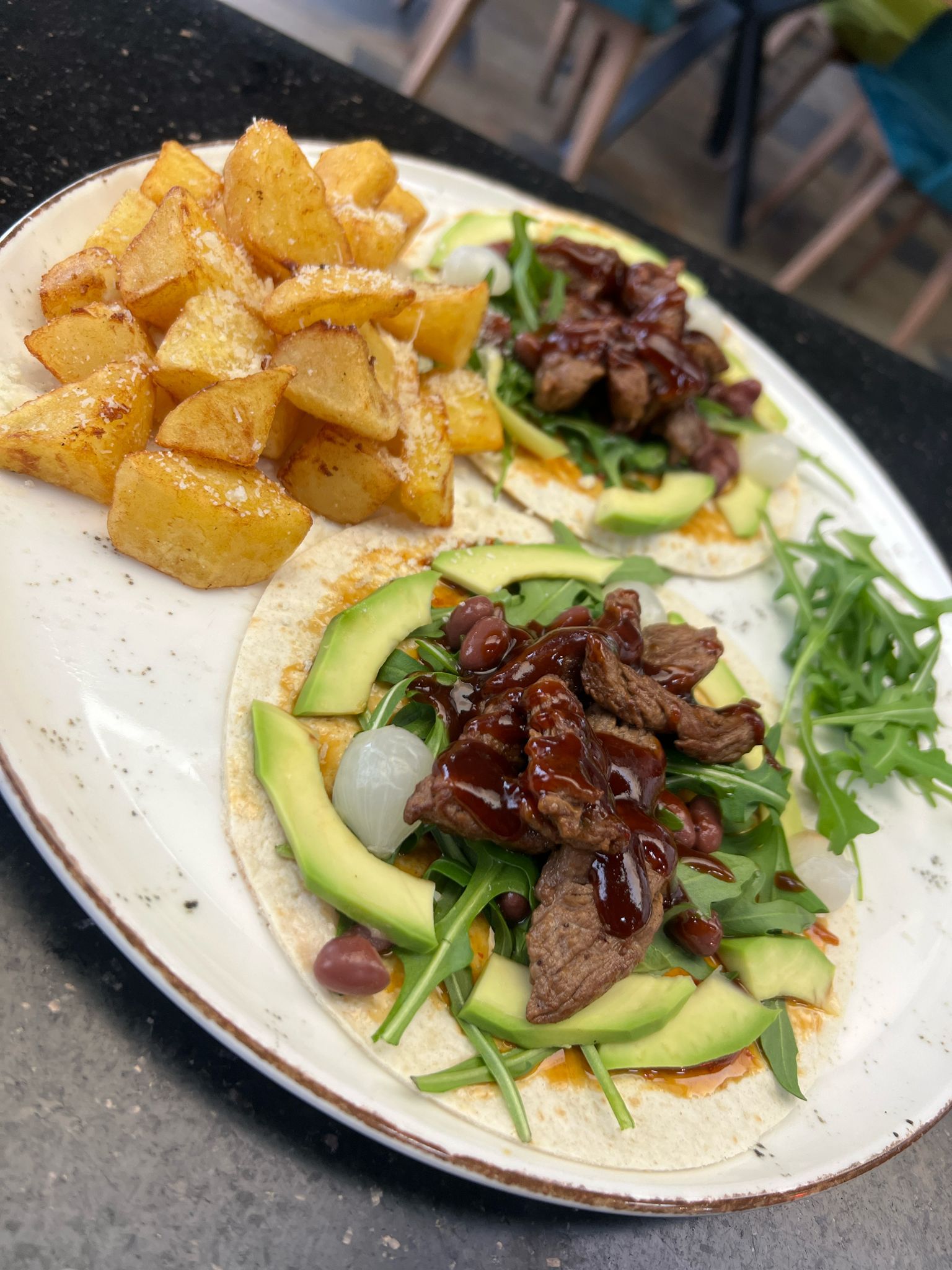 Carne de vită, fasole roșie, roșii cherry, salată rucolla, dulceată de cceapă, avocado, sos bbq, sos chili, miere, soia, lipie, cartofi